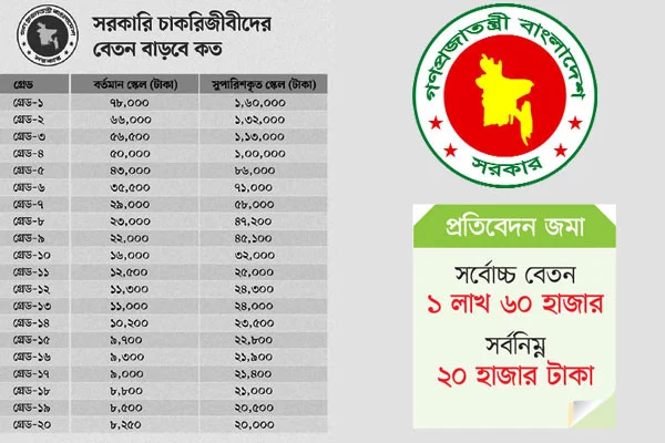 নতুন বেতন কাঠামোতে সরকারি চাকুরেদের বেতন ১০০ থেকে ১৪০ শতাংশ বাড়ানোর সুপারিশ করা হয়েছে। এর ফলে সর্বনিম্ন গ্রেড বা ২০তম ধাপে বেতন হবে ২০ হাজার টাকা। আর সর্বোচ্চ প্রথম ধাপে (প্রথম গ্রেডে) বেতন হবে ১ লাখ ৬০ হাজার টাকা। বিভিন্ন রকমের পর্যালোচনা শেষে বেতন স্কেলের গ্রেড বা ধাপ চলমান পে স্কেলের মতোই ২০টি গ্রেডই রাখার প্রস্তাব করা হয়েছে। সাবেক অর্থসচিব জাকির আহমেদ খানের নেতৃত্বাধীন ২৩ সদস্যের বেতন কমিশন গতকাল এ সংক্রান্ত প্রতিবেদন প্রধান উপদেষ্টা ড. মুহাম্মদ ইউনূসের কাছে জমা দিয়েছেন। বেতন কমিশনের জমা দেওয়া এ সুপারিশ পর্যালোচনা করে সরকার তা বাস্তবায়ন করবে। তবে নির্বাচনের আগে এ বেতন কাঠামো বাস্তবায়ন হওয়ার সম্ভাবনা কম। কমিশনের সুপারিশ অনুযায়ী এটি পুরো মাত্রায় কার্যকর হবে ২০২৬-২৭ অর্থবছরের প্রথম দিন অর্থাৎ আগামী ১ জুলাই থেকে।